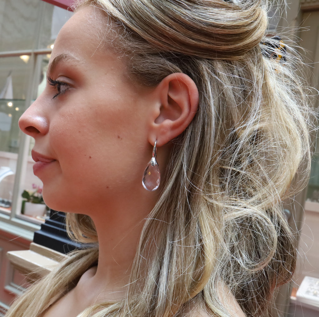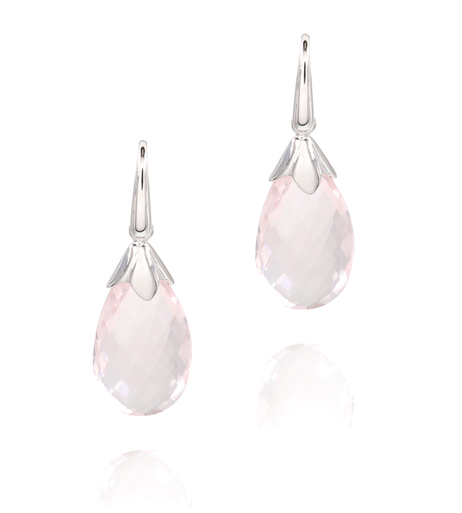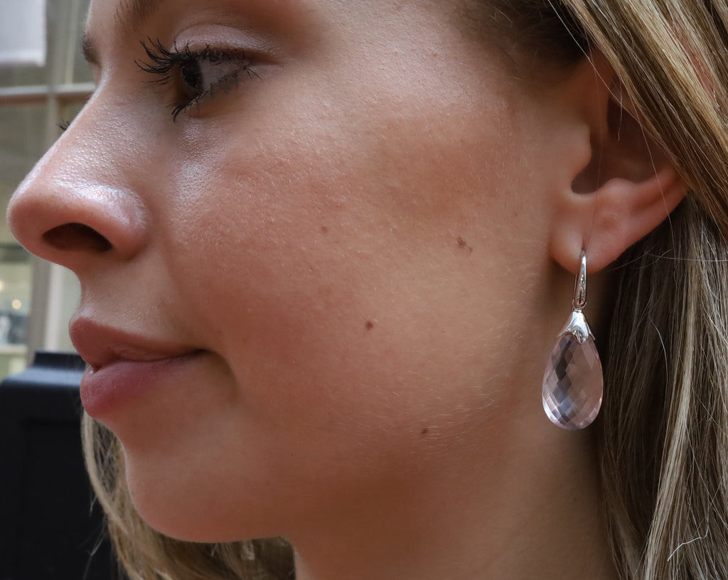 Total weight of Natural Rose Quartz 31.40 carats . These lovely translucent Rose Quartz drops are suitable for any occasion. Set in 9ct white gold exclusively handmade in our Sydney design jewellery studio. Free moving, elegant and timeless.